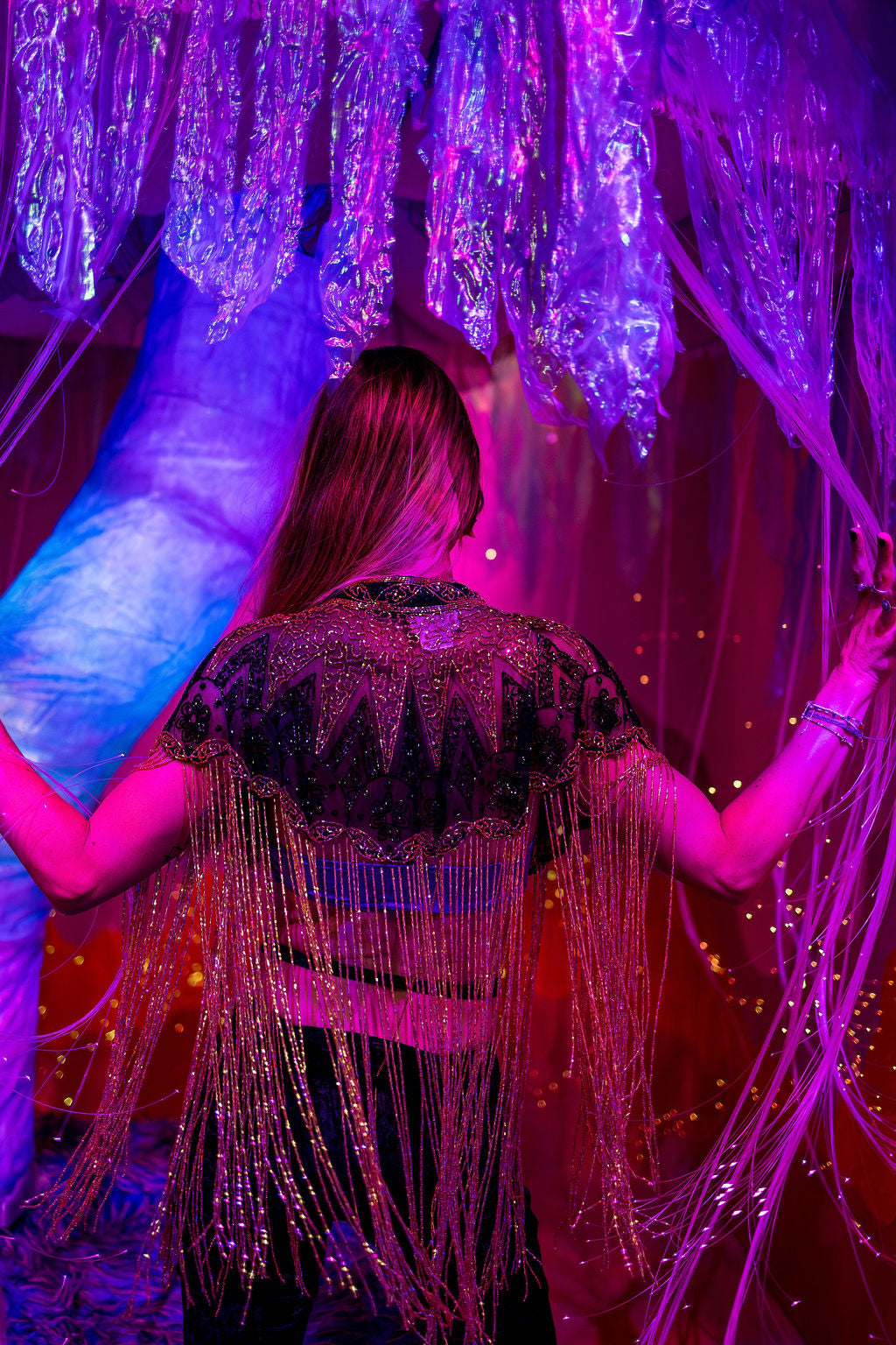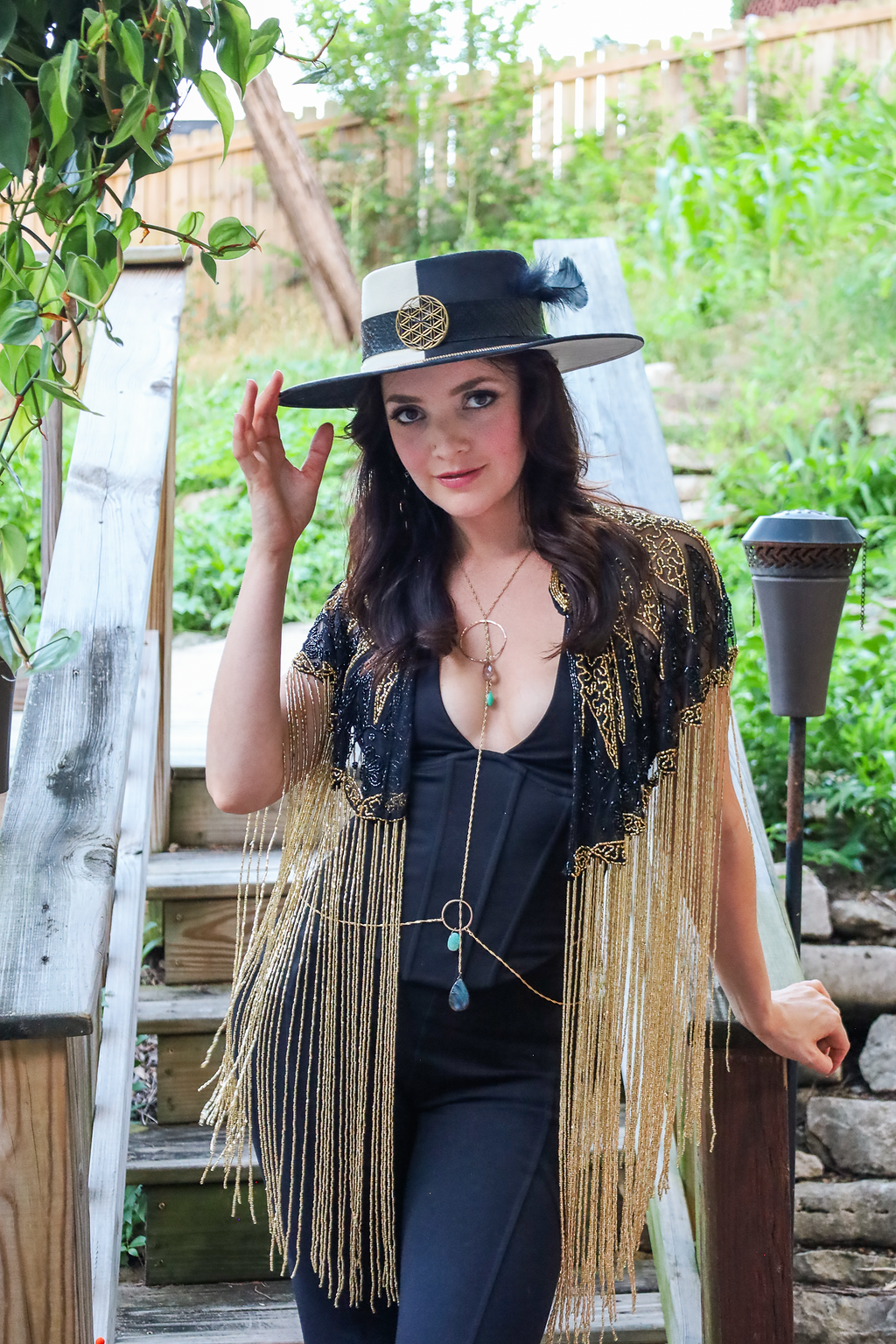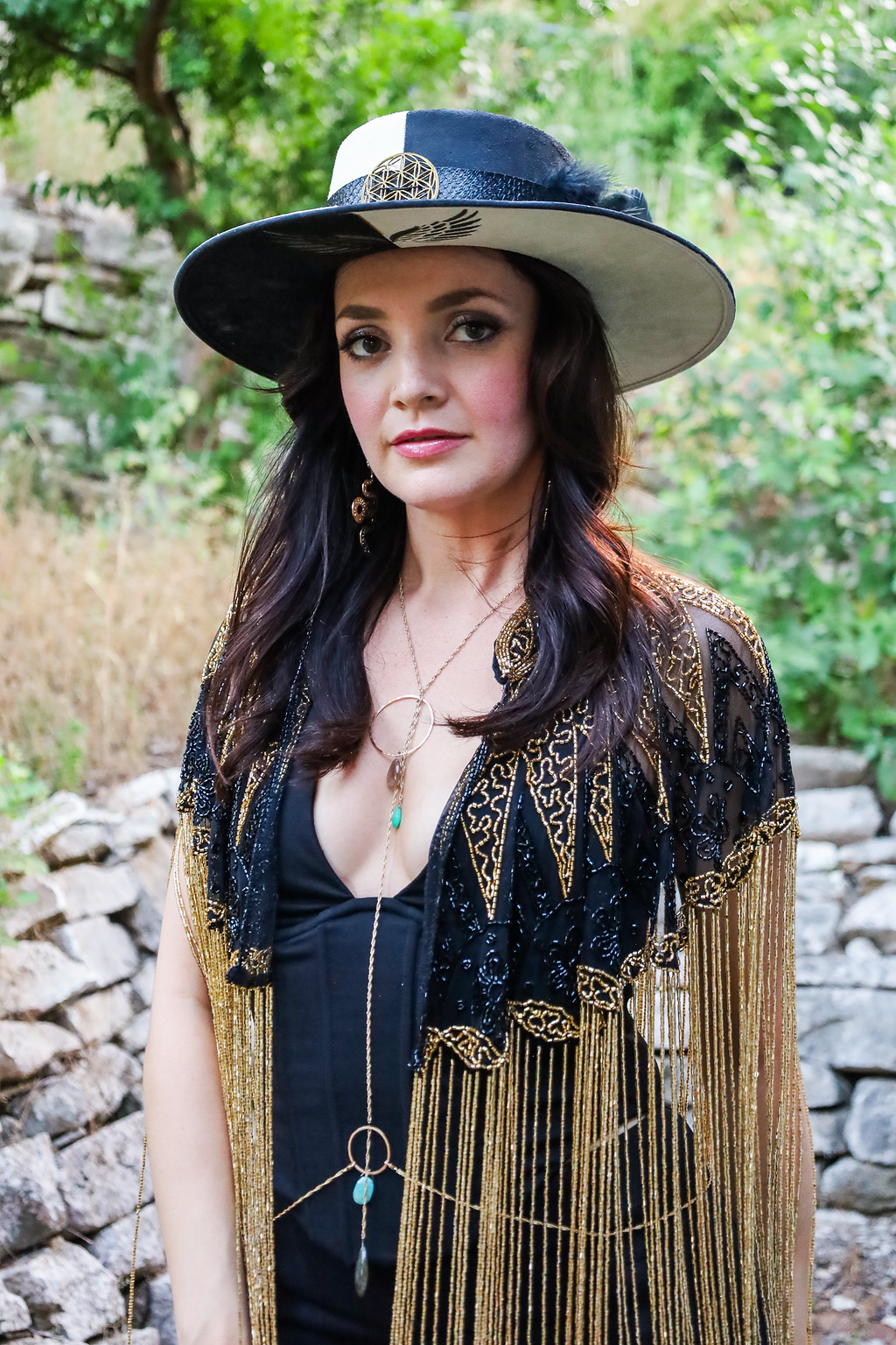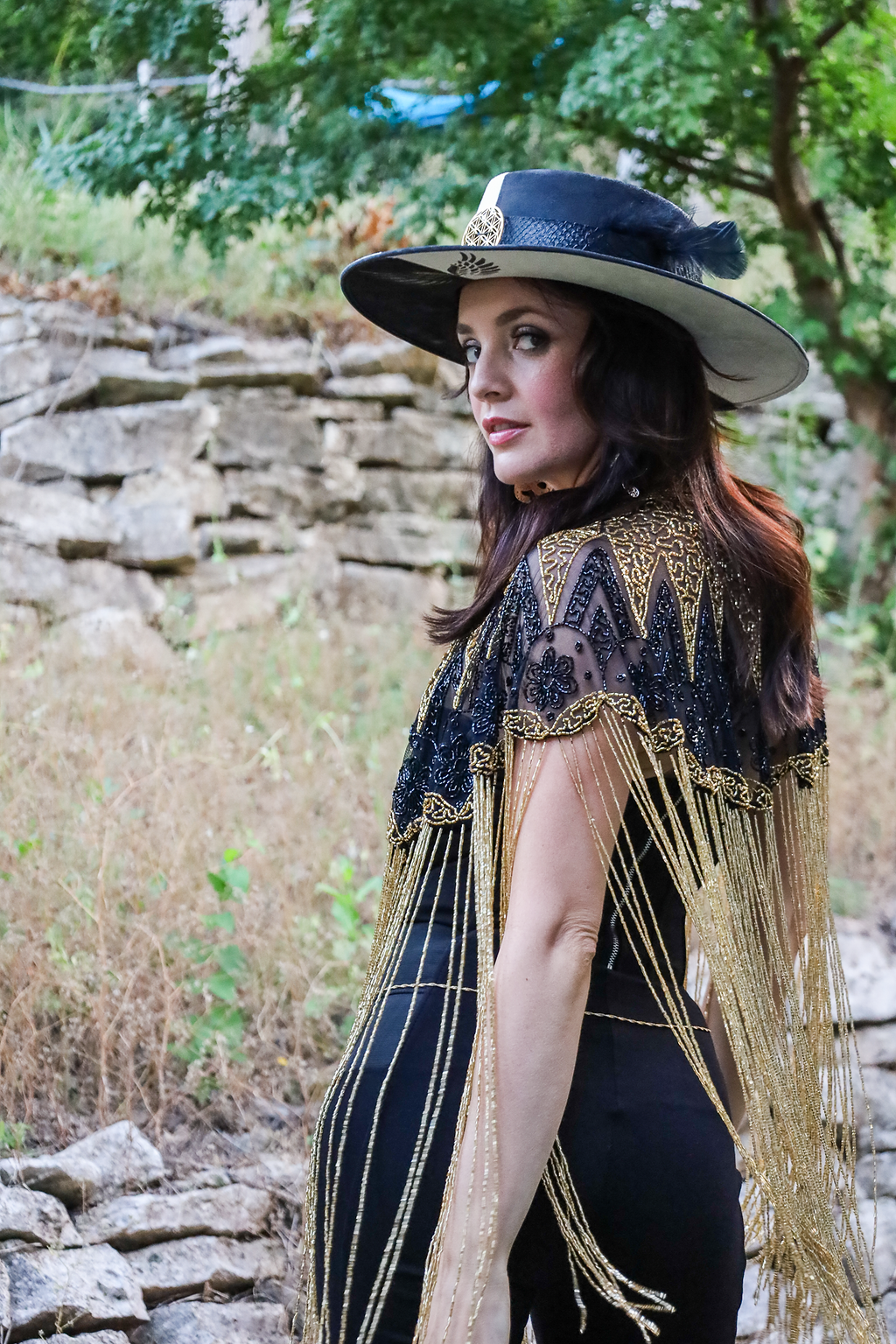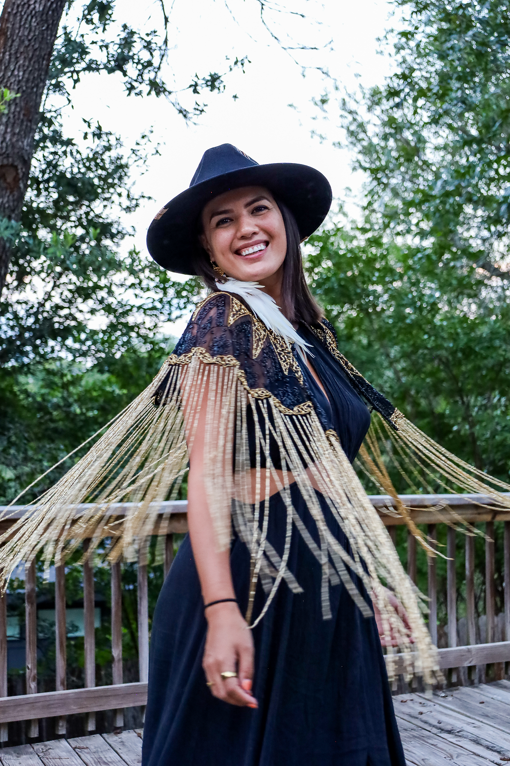 Inspired by the warmth of the sun, the Sundara Cape features cascading gold glass beaded fringe that moves beautifully with every step.
